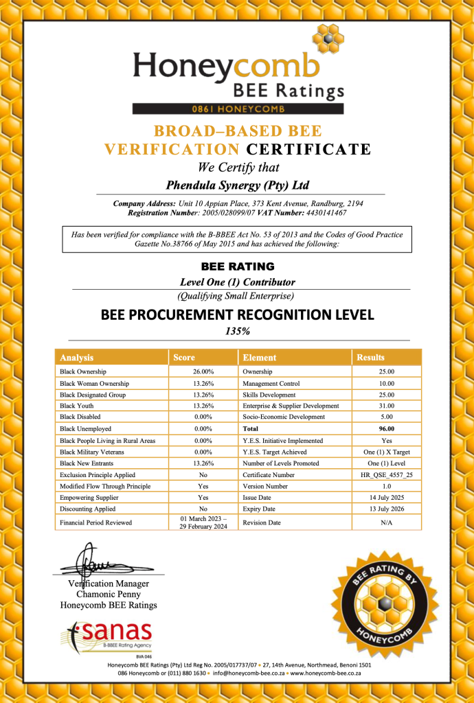 We are a Level 1 B-BBEE compliant company, committed to quality, compliance, and driving economic development in South Africa.